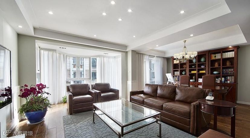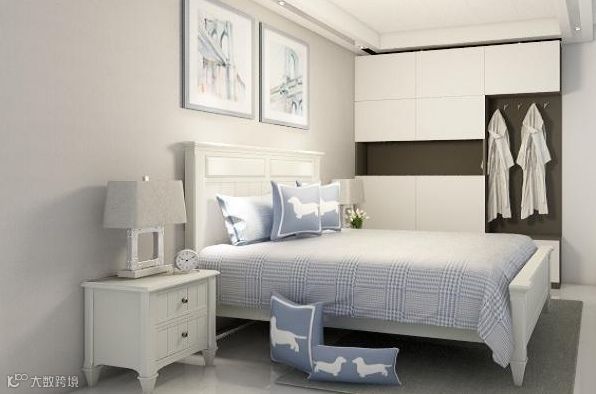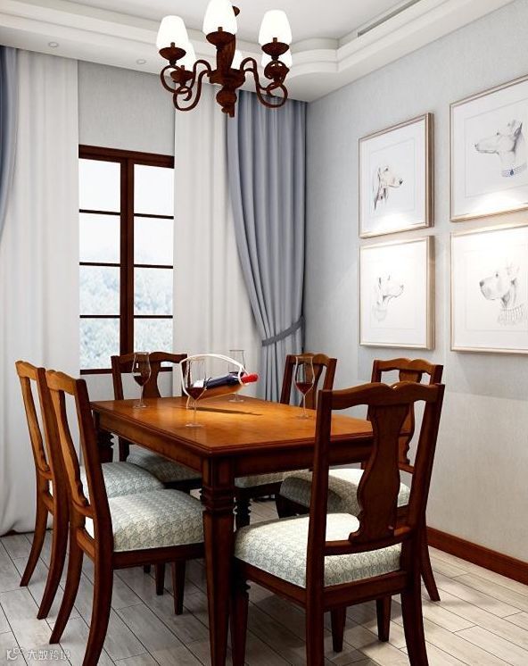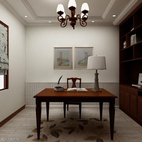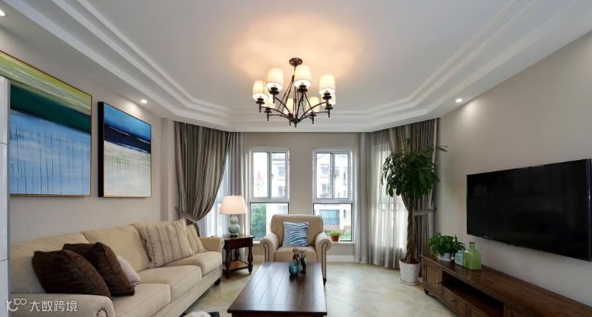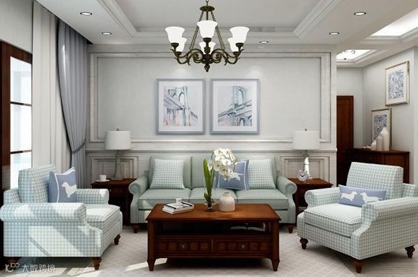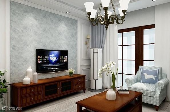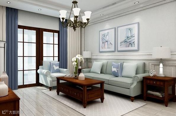 客厅整体色调是白色,老干部风格的淡蓝色布艺沙发,加上实木茶几、电视柜,形成了空间上的层次感。铁艺吊灯和台灯是美式不可缺少的元素,看起来上档次。