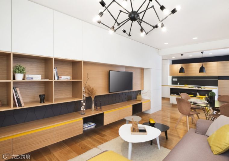 对于面积不是很大,承载更能却很多的客厅来说,如何将一些不想被外人看到的空间隐藏起来,打破空间的中规中矩,在保证了整洁的同时,还增强了空间的功能性。