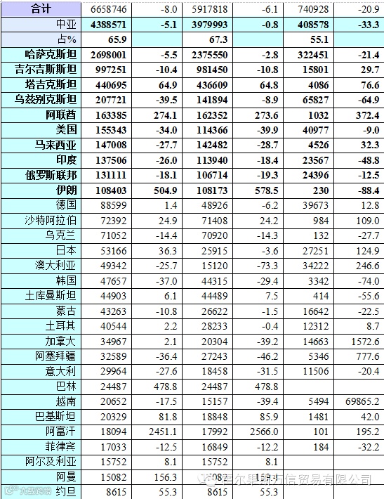 (三)对主要贸易伙伴进出口下滑。前十位国别中,对塔吉克、阿联酋、伊朗贸易分别增长64.9%、274.1%和504.98%,对哈萨克、吉尔吉斯、乌兹别克、美国、马来西亚、印度、俄罗斯的进出口分别减少5.5%、10.4%、39.5%、34%、27.7%、26%和18.1%。