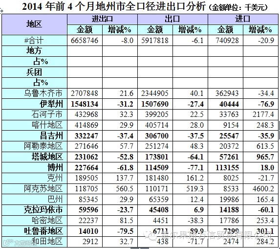 前4个月,乌鲁木齐、石河子、喀什、阿勒泰、阿克苏等分别增长21.6%、32.3%、29.9%、57.7%和4.6倍。同时,伊犁州、昌吉、塔城、博州、克拉玛依分别下降31.2%、37.4%、52.8%、61.8%和23.7%。