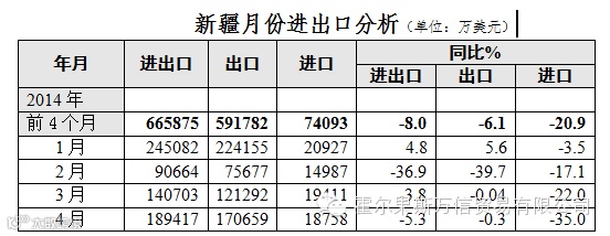(一)出口、进口双下降。前4个月降幅比上月回落1个百分点。增速比上年同期回落20个百分点。