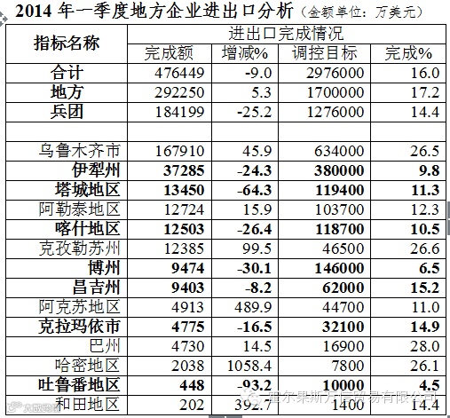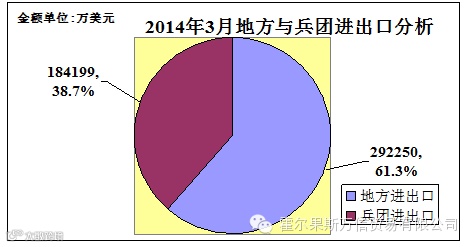 (四)区域发展不平衡。一季度,兵团企业进出口18.42亿美元,下降25.3%,占全区外贸总值的38.7%;地方企业进出口 29.22亿美元,增长5.3%,占全区外贸总值的61.3%。