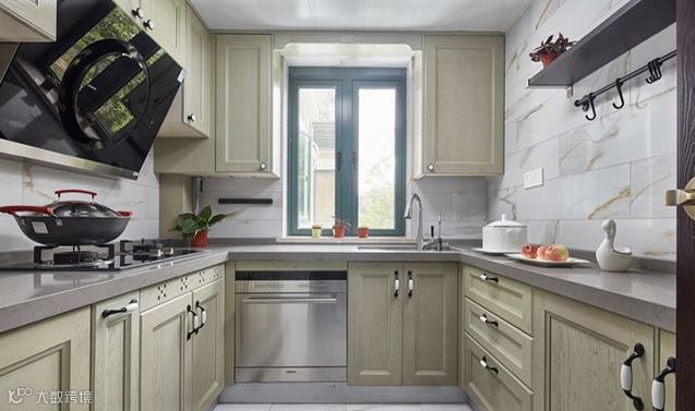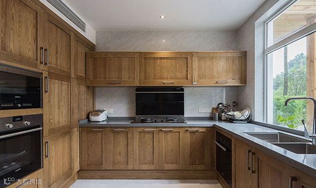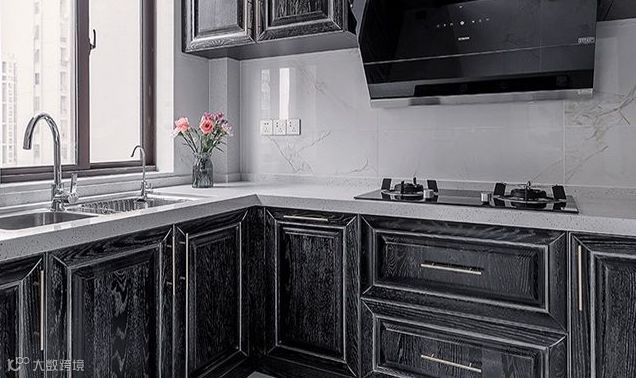 如果你喜欢江南烟雨的那种意境,想必这款厨房装修图能满足你。虽然厨房空间不大,但胜在户型结构有优势,L型的橱柜符合人体的行为习惯,又可以将操作台面划分开来,日常烹饪使用也极其的方便。橱柜采用了黑灰色木纹的面板,配上白色的大理石台面,以及墙地面都是灰色纹路的瓷砖,为我们展现了一个水墨色彩浓厚的厨房空间。仿若来到了雾气氤氲的江南水乡,朦胧又唯美。