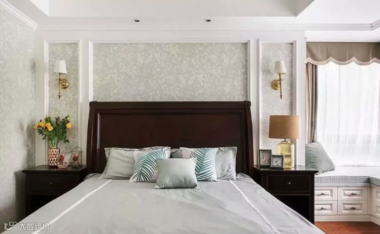 主卧以浅色调为主,营造大气庄重的空间格调。超大L型飘窗配以浪漫的窗纱和舒适的抱枕,打造轻松随性的休闲区。