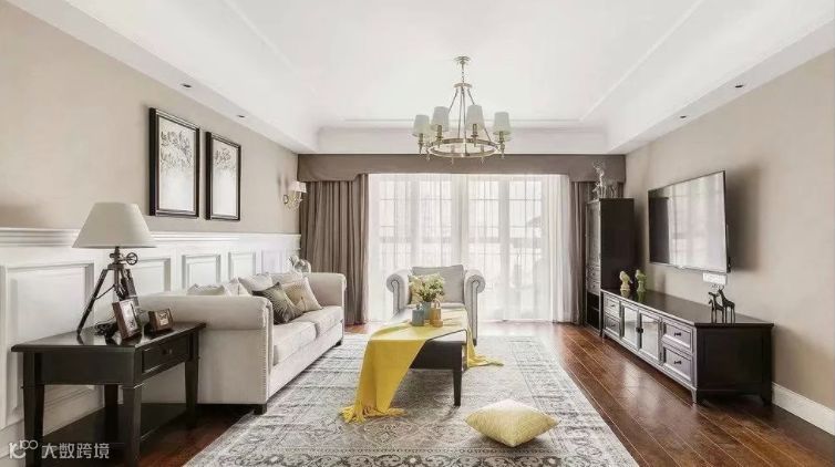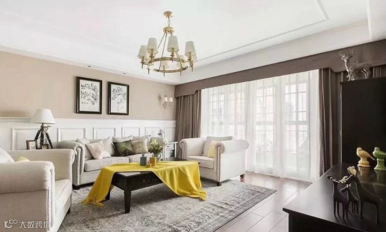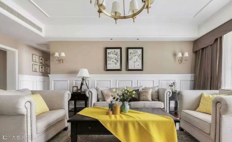 风格定位为随性自在的现代美式。整体色调为米色、驼色等中性色调为主,搭配黄色、蓝色、绿色提亮空间,在沉闷的生活中,为家带来一抹色彩。
