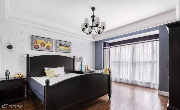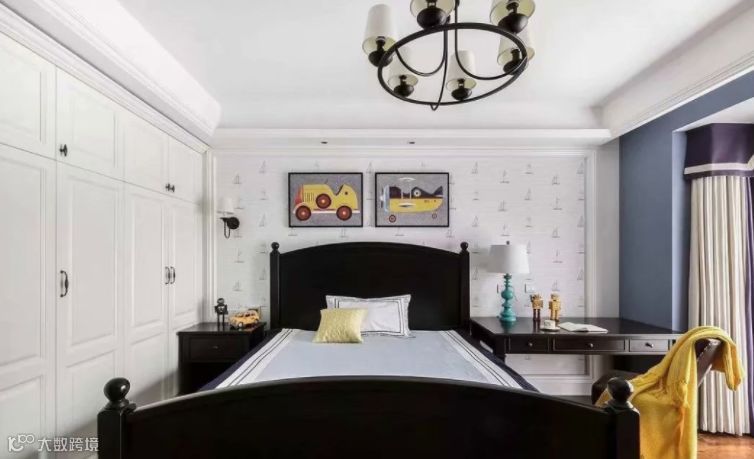 儿童房采用帆船壁纸搭配蓝色的床品,使整个空间显得十分安静,给孩子一个属于自己的小天地。
