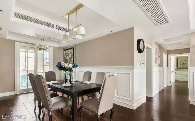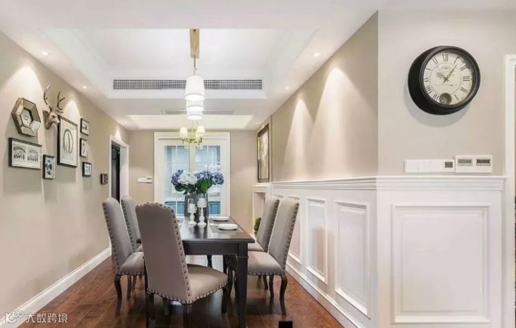 木质的餐桌搭配皮质的餐椅散发着浓郁的美式气息,墙面上的装饰,为空间添了一份艺术色彩。