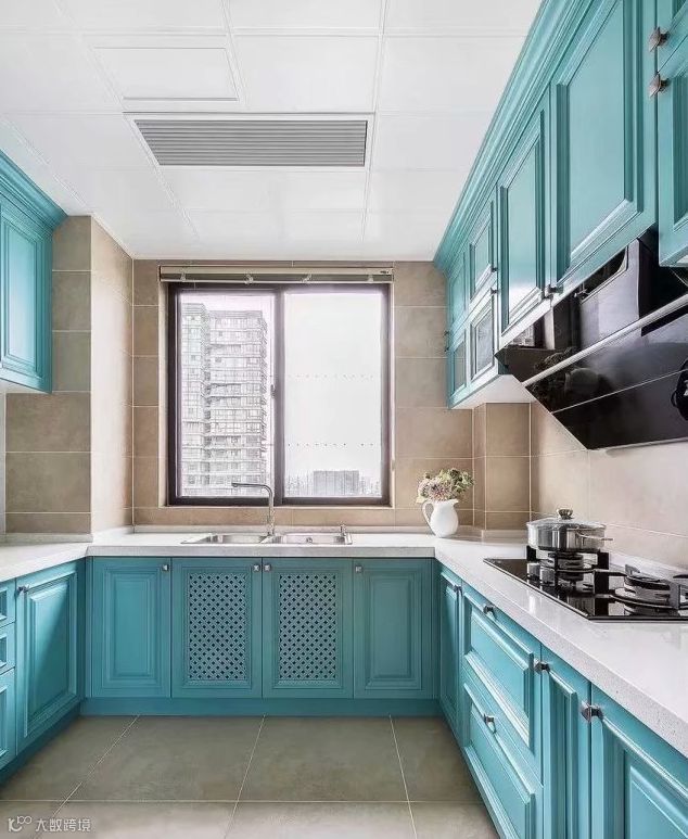 厨房蓝色的橱柜清新浪漫,整体宽敞明亮,让下厨也能轻松愉悦。