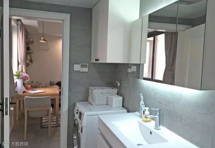 卫生间打造更宽敞自由的空间,将洗手台向里面移位,留出空间放洗衣机。深灰色的磨砂墙砖,配上隐藏的灯源,看起来颇有感觉。