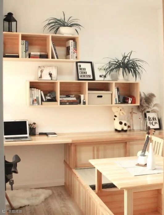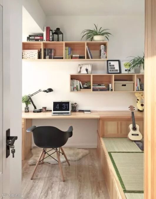 书房,作为工作区,统一的原木色书柜、书桌营造出整洁的环境,更容易让人放松。全部定制的家具,可以充分利用每个空间,工作、收纳、休息都不耽误。