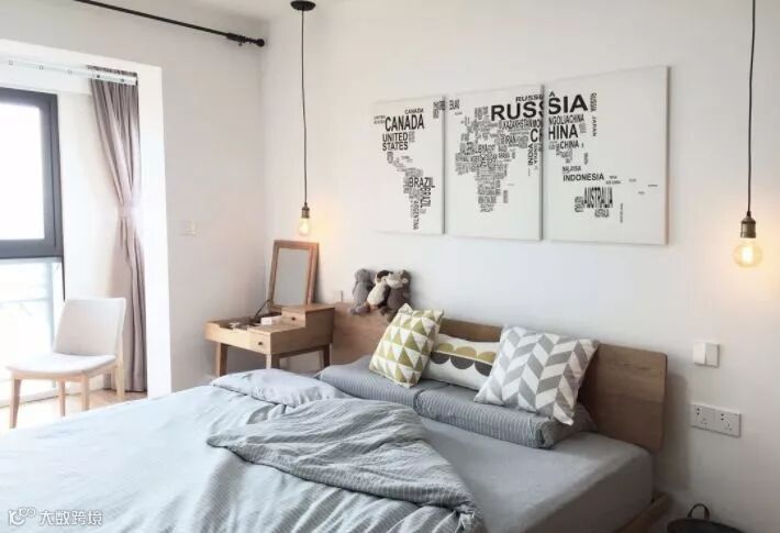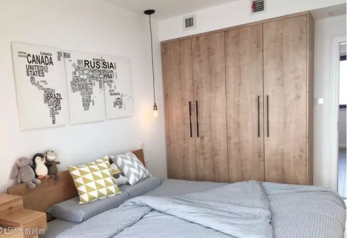 白砖墙配上网红灯,妥妥的清新自然风。玄关比较宽敞,将玄关镜和换鞋凳单独放在一边,对面就是定做的满墙嵌入式鞋柜,收纳空间非常充足。