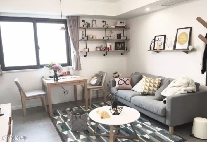 不大的客厅还能兼具餐厅的功能,选择了一款能伸缩的小餐桌,生活轻松又惬意。沙发墙上的置物台,既点缀了空白的墙面,也能有收纳和展示的功能,家的氛围就这样一点点温馨起来。