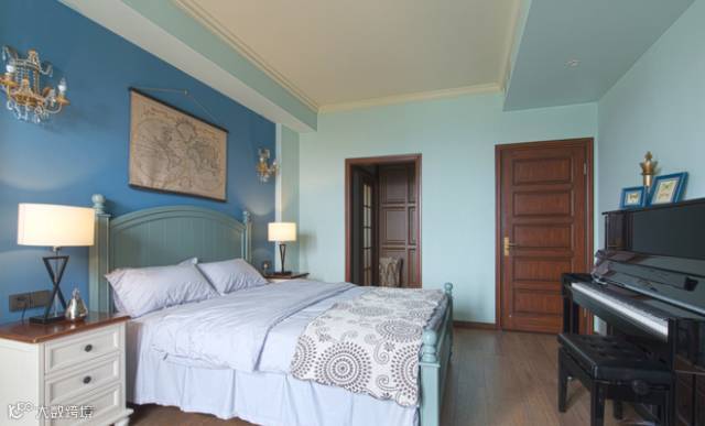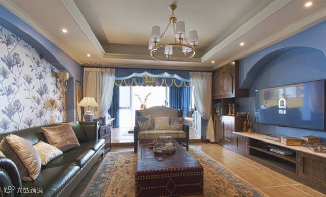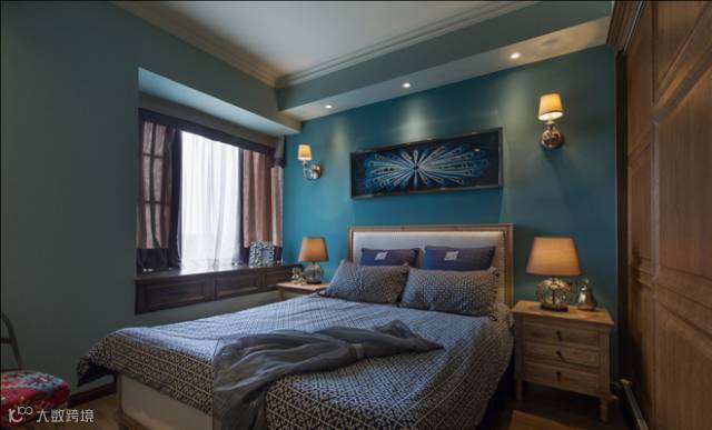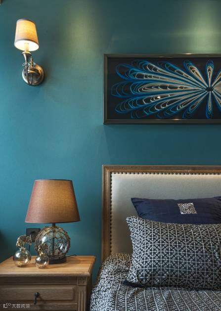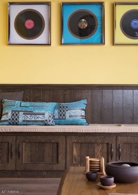 客厅运用到的一些湖蓝色以及局部黄色等跳色墙面处理,保证整体空间色彩协调且大面积为中性色的前提下而进行的大胆尝试。