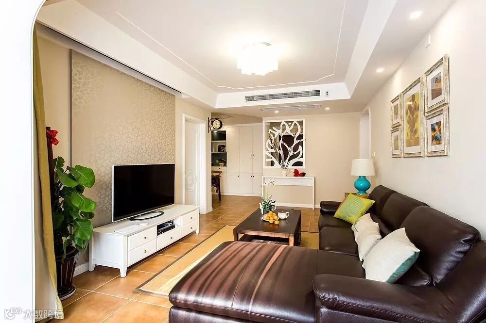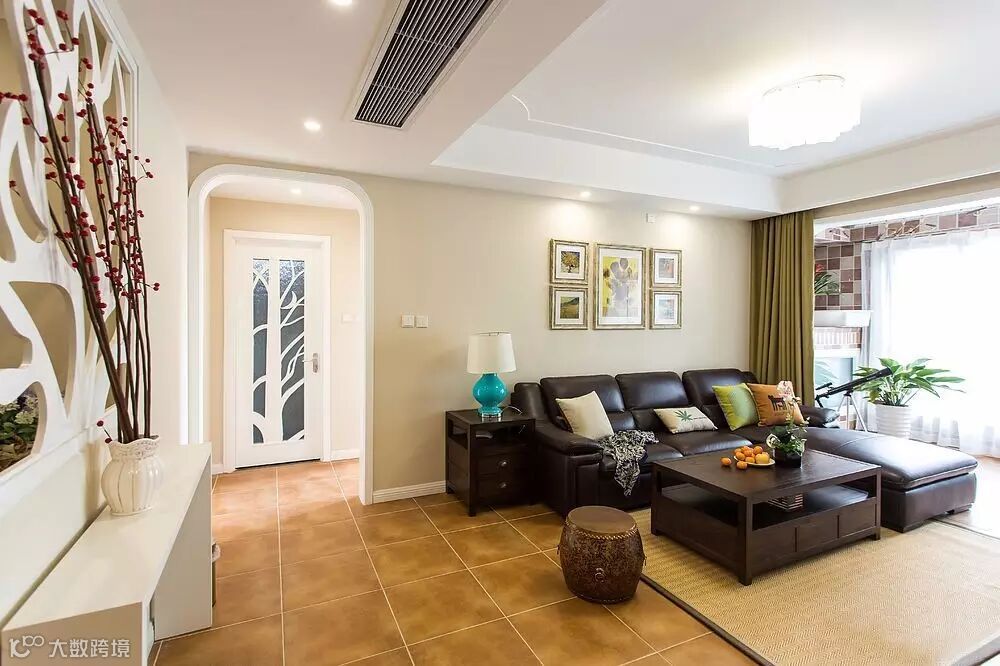 ▲客厅地面采用中度颜色地砖,沙发背景墙由墙画点缀,使墙面不再单调。