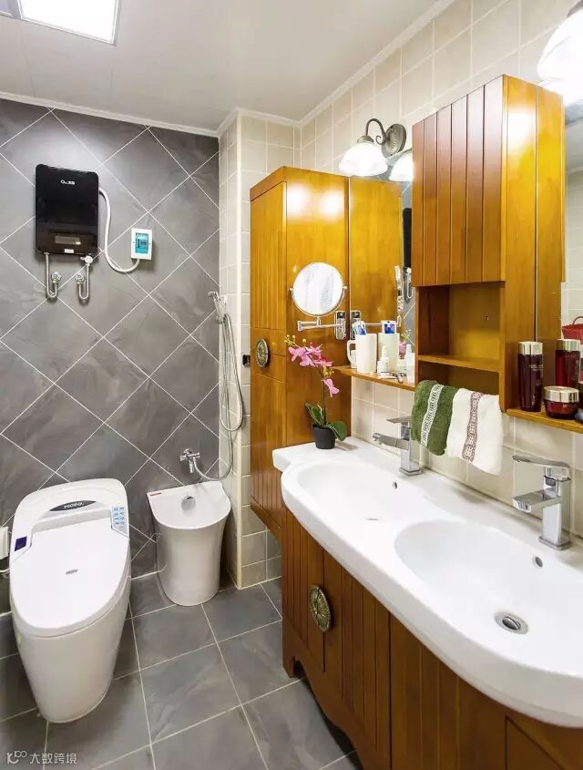 ▲洗手间的空间足够大,采用了浅灰色的瓷砖、洁白色的卫浴、橡木浴室柜,这不单单是色彩的碰撞,置身于内,更是一次身心的美丽旅行。