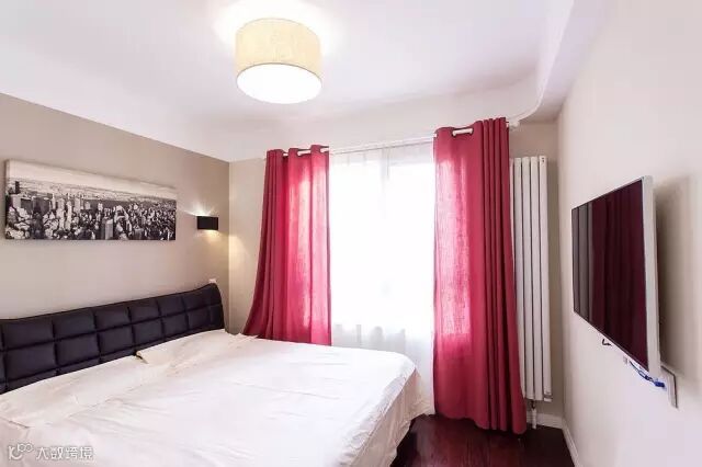 ▲卧室洁白通透的空间、灰度红色的窗帘、真皮大床后的墙面上悬挂纽约城全景照片,阳光透过窗子照射向明快的居室内,整个房间变得温暖无比。