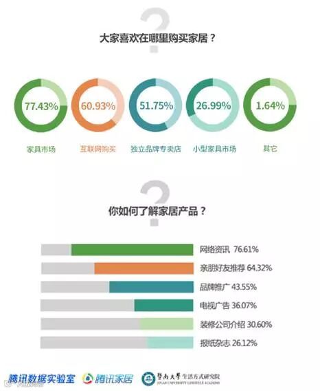 在购买渠道中,消费者喜爱在家具市场或是通过互联网购买家居产品,而互联网提供的便利购买途径与口碑推荐等信息则是消费者下单的重要因素。