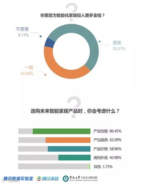 消费者在选购智能家居产品时,主要考量因素依次为性能、服务、价格与高档外观。相对于男性而言,女性用户不仅更在意产品的购买体验,对于产品服务的要求也较高。