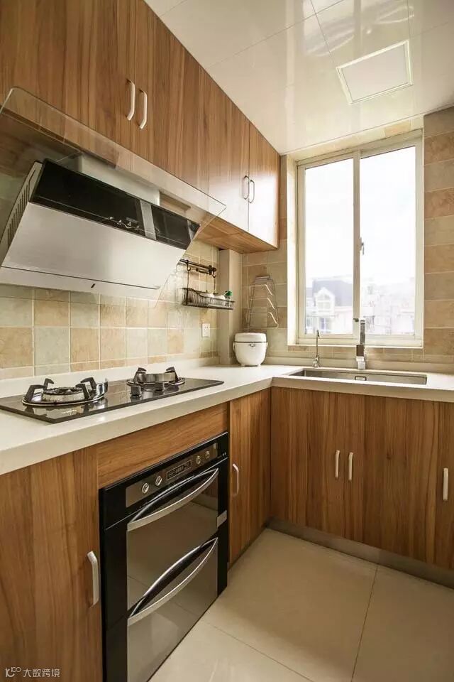 仿古的小砖铺贴整个厨房的墙面,搭配木质的厨房,呈现出一种自然的味道,白色的台面让整个厨房更加的干净整洁。