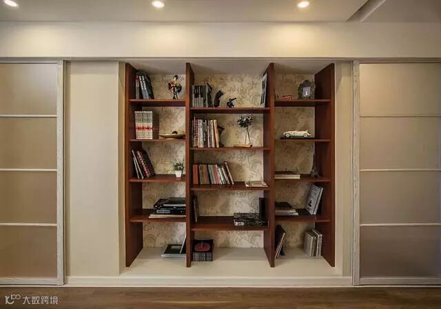 造型书架结合两边的移门,成了独特的背景墙,两边的移门分别是通往衣帽间和楼梯间的门。