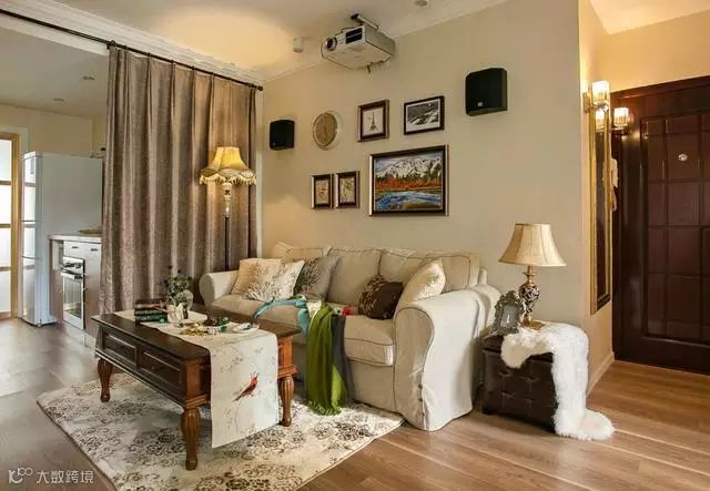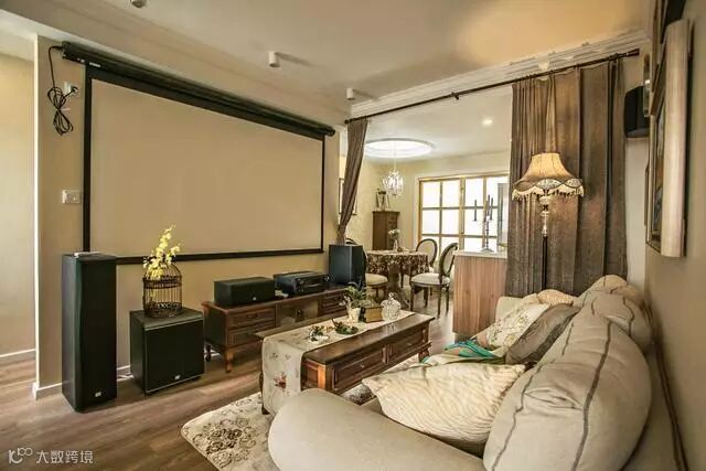 温润的木质地板铺设整个空间,复古的家具将美式营造的更加简约,用窗帘区分开公共的区域,投影仪的出现,可以在家轻松的观看各种大片,极其享受。