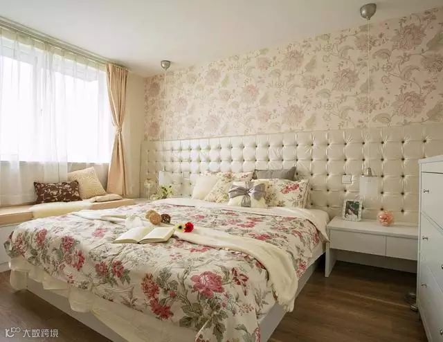浪漫的大花壁纸铺设,搭配小奢华的皮质软包,打造出一个浪漫的睡眠空间,假的飘窗设计让整个卧室看起来更加的惬意。