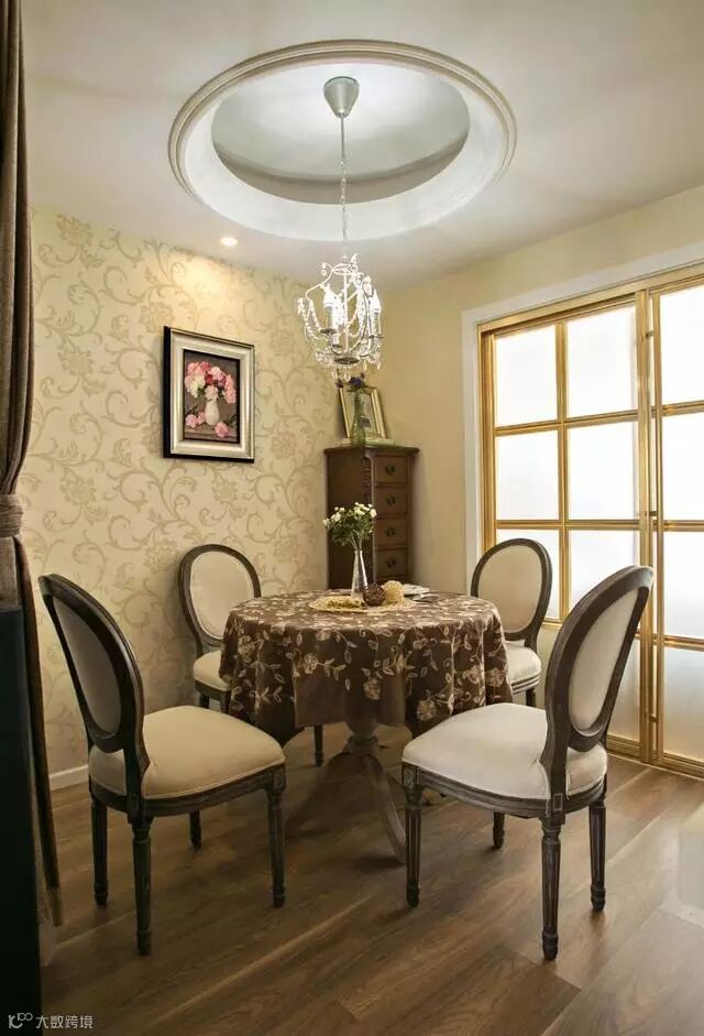 木质桌+鹅蛋椅,搭配浪漫花纹的桌布,美式风格里做出了法式浪漫风,造型别致的吊灯缓缓垂落在餐桌上,营造出浪漫的用餐氛围。