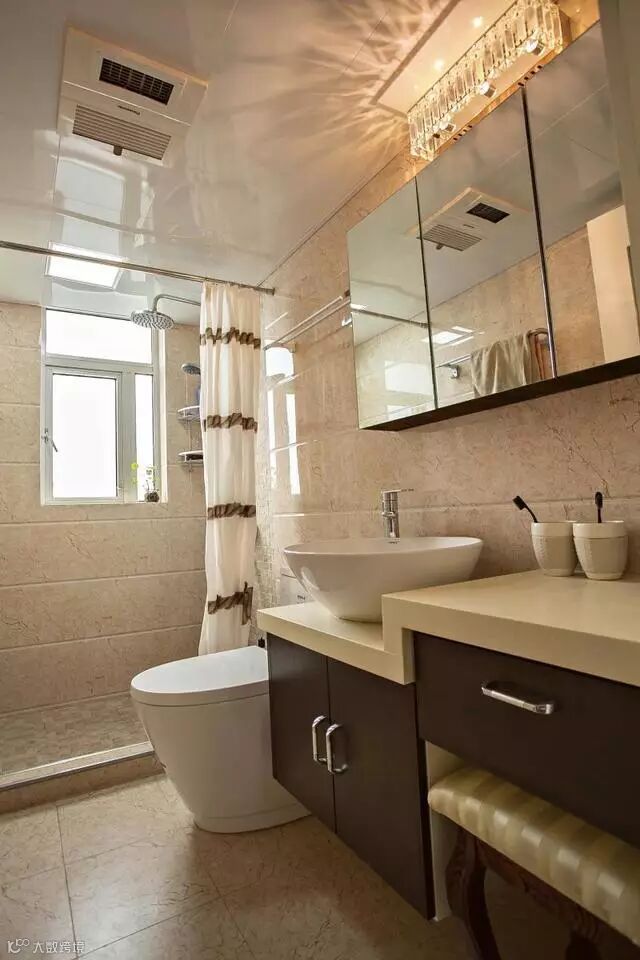 仿大理石纹的瓷砖配上实木小凳子,卫生间也能做出小复古的感觉。
