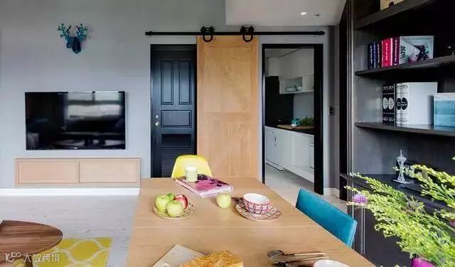 ▲厨房采用吊轨门的设计,吊轨门不会占用空间。在做饭时将门关起,不会使油烟“跑到”客厅中。