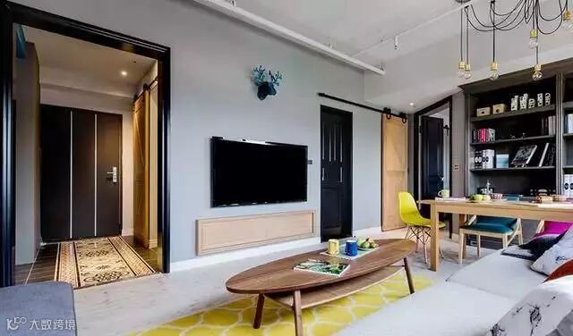 ▲吊灯的设计为客厅又增添了一抹个性,蓝色的纱窗在保证良好的遮阳效果时,又具有美观性。黄色的地毯,木质的茶几,给人眼前一亮的感觉。
