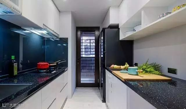 ▲黑色的桌面,使厨房变得很好打理,多个橱柜可以容纳许多杂物,更能使所有东西分类放好,为取物提供了方便。