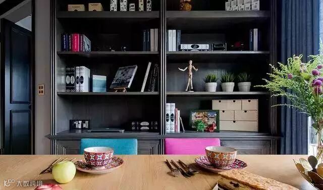 ▲黑色的书柜,上面摆放着自己喜欢的书,和工艺品,起到收纳的同时又具有美观性。