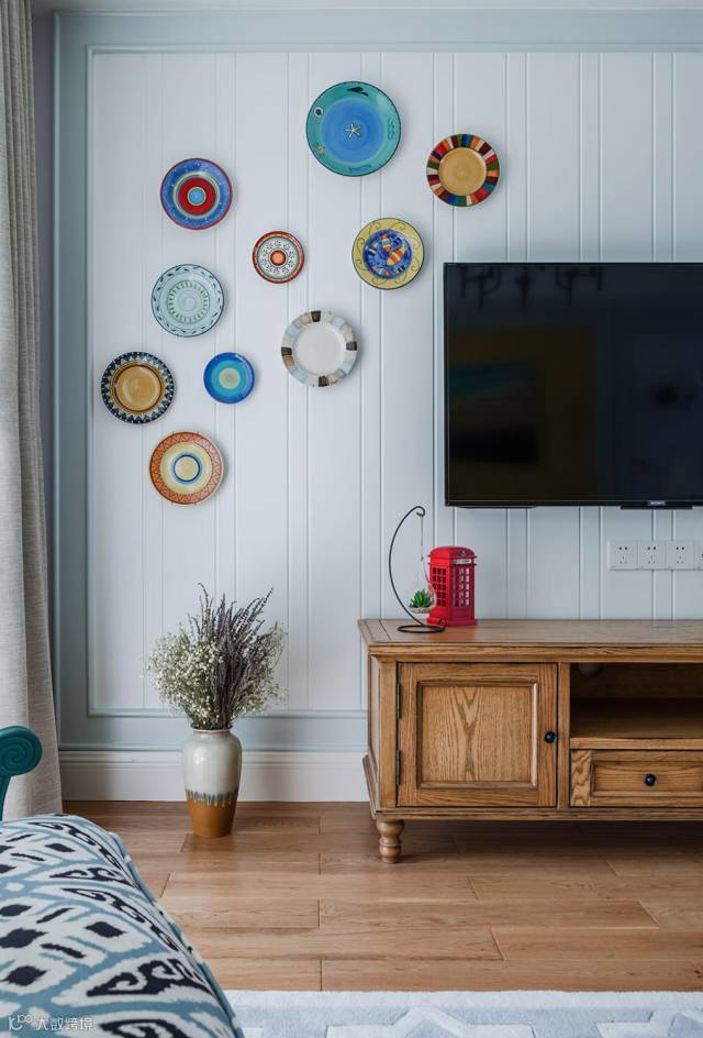 ▲ 电视背景用木饰面拉缝做造型,角上点缀七彩挂盘装饰