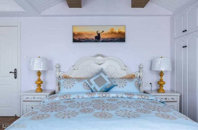 ▲ 白色的欧式雕花床和床头柜,和整体美式风格有点出入