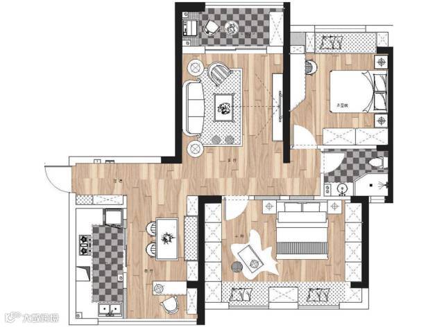 ▲ 整个空间通铺手抓纹地板,显示出木质的精致和暖意