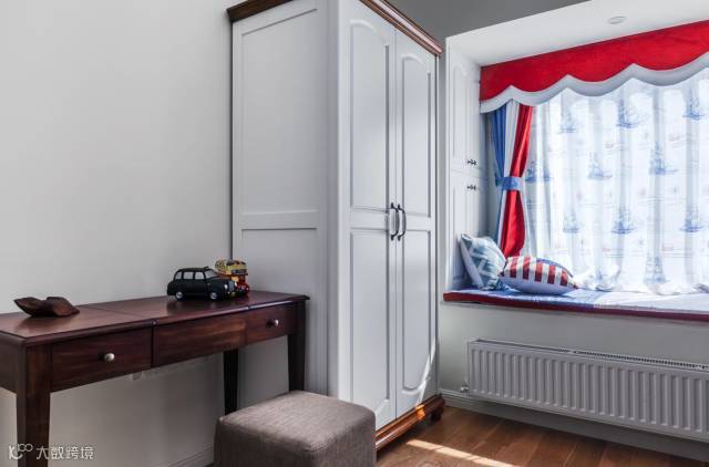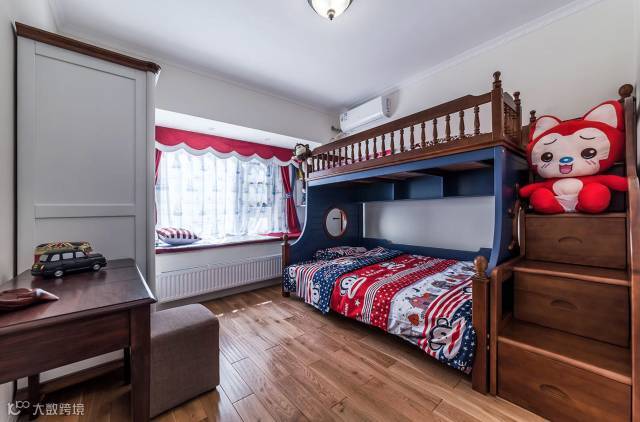 ▲ 儿童房采用蓝红色的软装,是美国星条旗的色调,高低床是孩子比较喜欢的元素