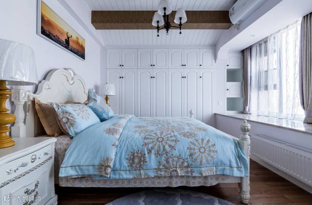 ▲ 卧室选用了偏欧式的家具,斜顶吊顶增添了休闲感,一整面墙的衣柜实用性强