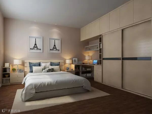 主卧收纳侧重在衣物的收纳上,一柜到顶的衣柜+书桌+床头柜,让整面墙都变身收纳区。左侧的墙缝间还有惊喜:层板架腾出的空间可以放置一些睡前书籍,也极具小心机。