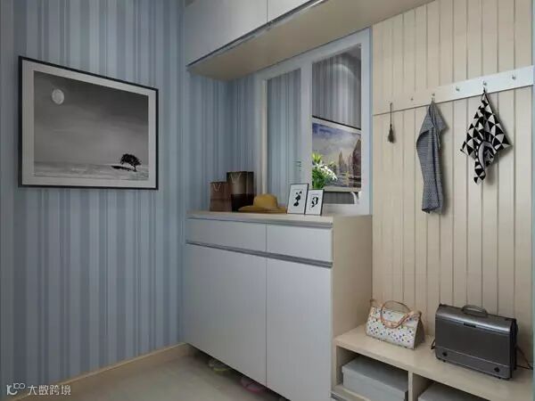 高度适中的鞋柜让出入的收纳更人性化更便利;悬空收纳柜主要用来放置换季的鞋子;护墙板让入户具备了小衣帽间的收纳作用。