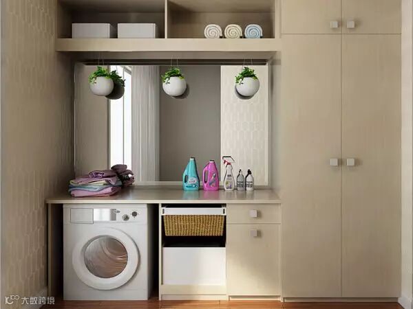 阳台的区域,设计师加入了阳台柜的设计。这样既起到了收纳作用,又给予了生活不同程度的便利(如:衣物洗净可直接从洗衣机拿出晾晒;下雨天难干衣物有柜可储、有机烘干;脏衣物可储洗衣篮等)。
