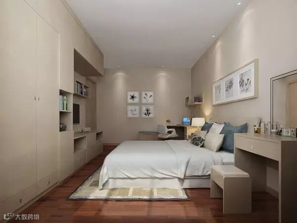次卧的设计并不是简单的铺陈,而是将生活所需融入到空间当中。梳妆台兼顾床头柜的功能,十分大方且很实用。