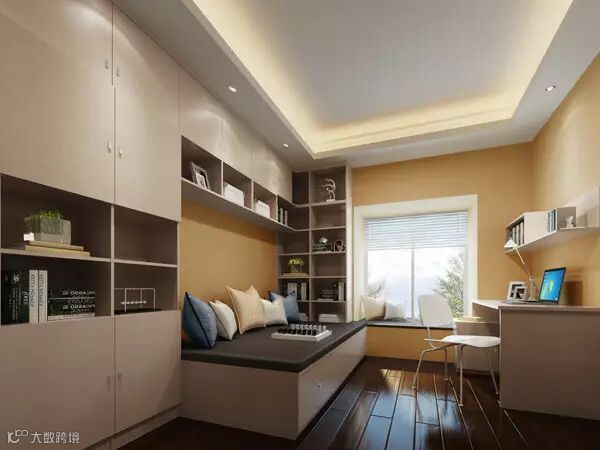 书房采用了一体式的设计,使空间更为宽敞,极强的收纳力度使得家中的杂物有地可储。