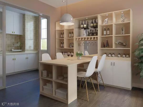 餐厨空间采取了半开放式的设计,餐桌脚不是简单的支架,而是设计成“田”字型的收纳柜,既满足了业主对于餐具收纳的所需,又保证了整体空间的美观度。