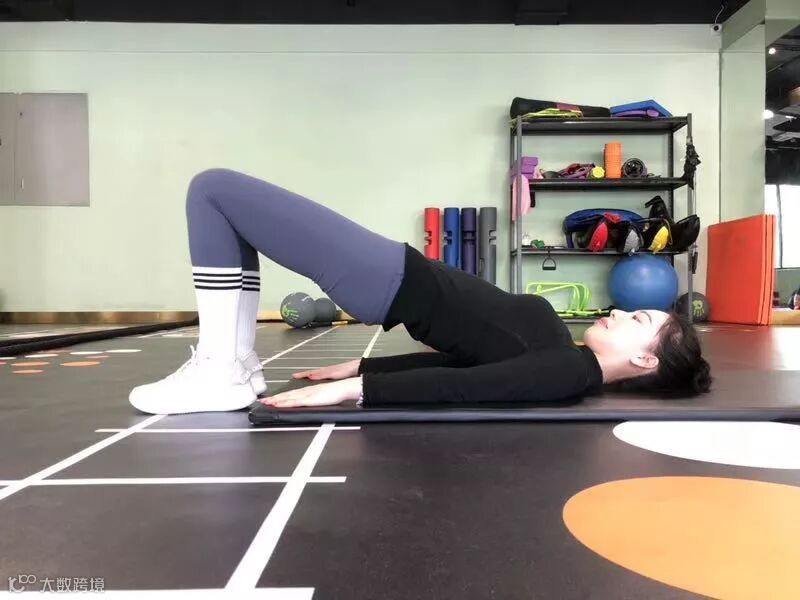 动作要求:起始位,仰卧,双膝弯曲并分开与骨盆同宽,双脚着垫,掌心朝下,肩胛骨保持稳定,呼气,稳定骨盆和脊椎保持中立位,伸展髋部,使骨盆上抬离垫,使双肩双膝之间成桥形。