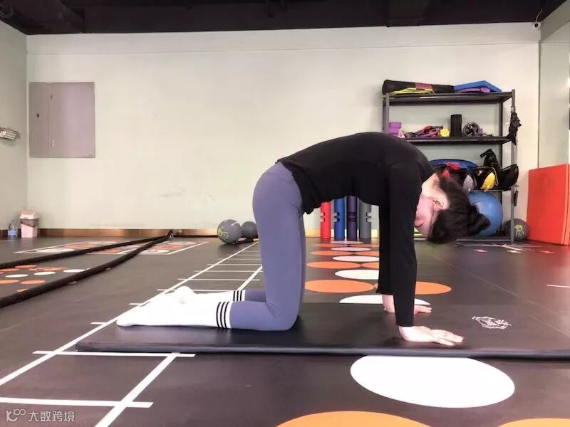 动作要求:起始位,双手和双膝支撑身体,双臂在双肩下方,双膝在髋部下方,双膝分开与骨盆同宽,呼气,开始卷动,使髂前上棘离开大腿骨前部,按照从尾骨到头部的逐节活动脊椎,吸气,再逐节从尾骨到头部的顺序稍微伸展脊椎。