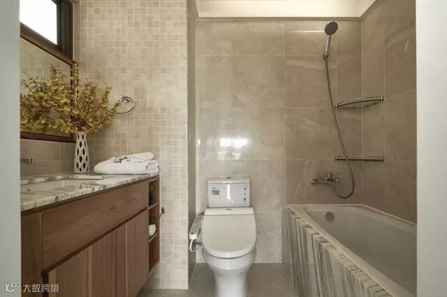 主卫:设计师以相近色系,结合磁砖、石材的纹理,围塑出如置身在自然大地的沐浴场域。