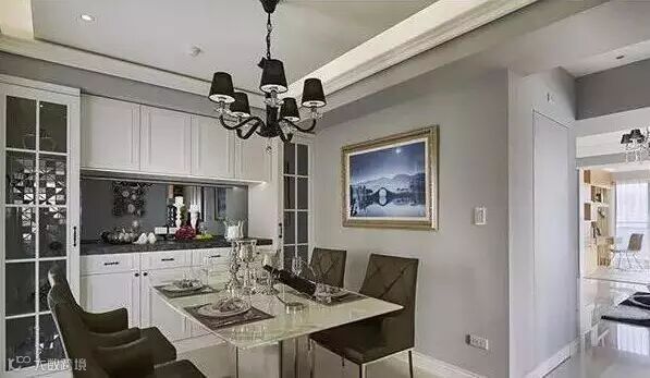 餐厅:以窗格贴镜手法妆点收纳柜的门片,同时也消化了柱体,呈现出古典设计的对称元素。