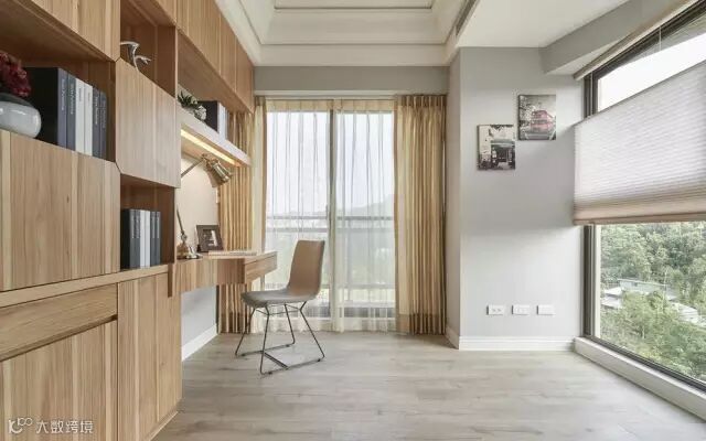书房:原木色书柜搭佐窗外绿意,在简约线条的勾勒下,演绎了无印风格的自然设计语汇。