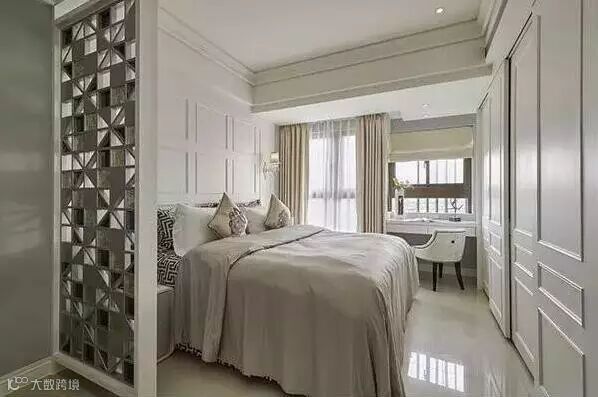 主卧:由铁工烧制而成的屏风,结合玻璃材质运用镶贴和嵌入手法,变化出丰富的几何造型,铺陈出室内最美的风景之一。