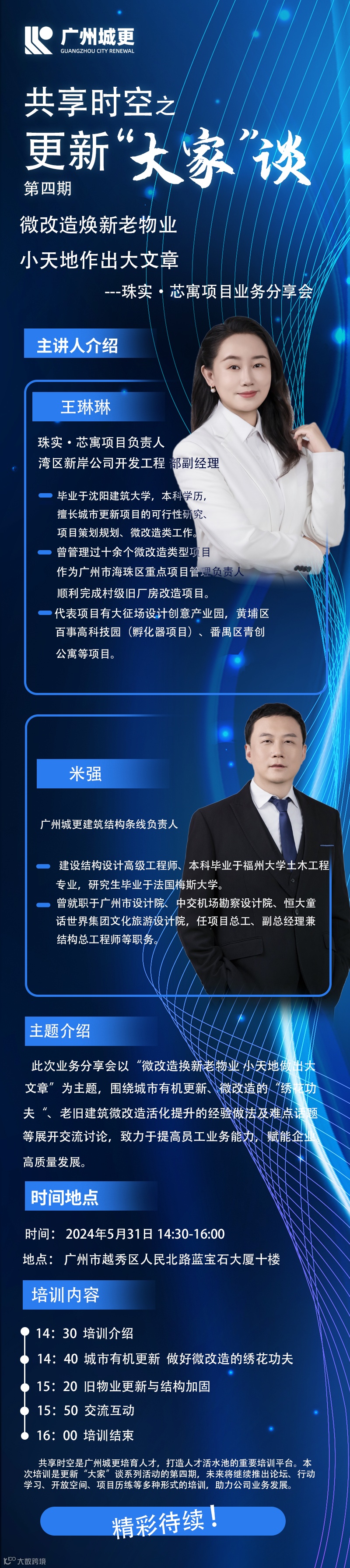 共享时空之更新“大家”谈主题培训活动是广州城更培育人才、打造人才活水池的重要平台,本次培训是系列活动的第四期,未来将继续推出论坛、行动学习、开放空间、项目历练等多种形式的培训,致力于提高员工业务能力,打造新质生产力,赋能企业高质量发展。